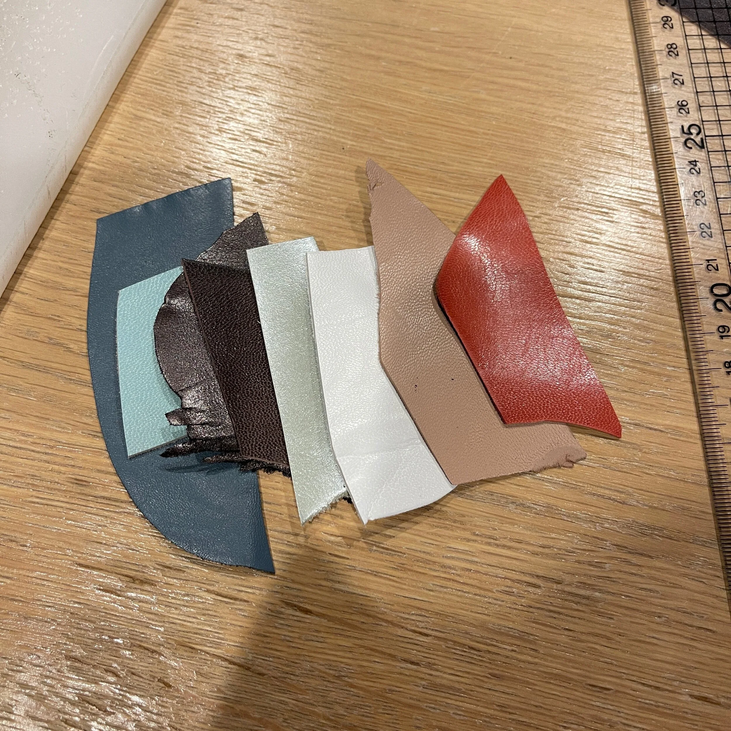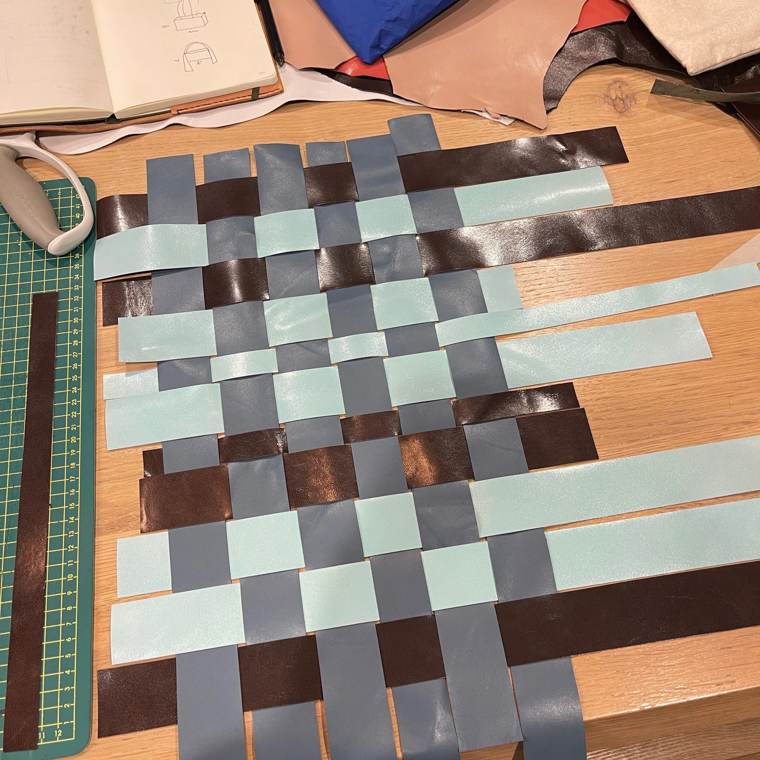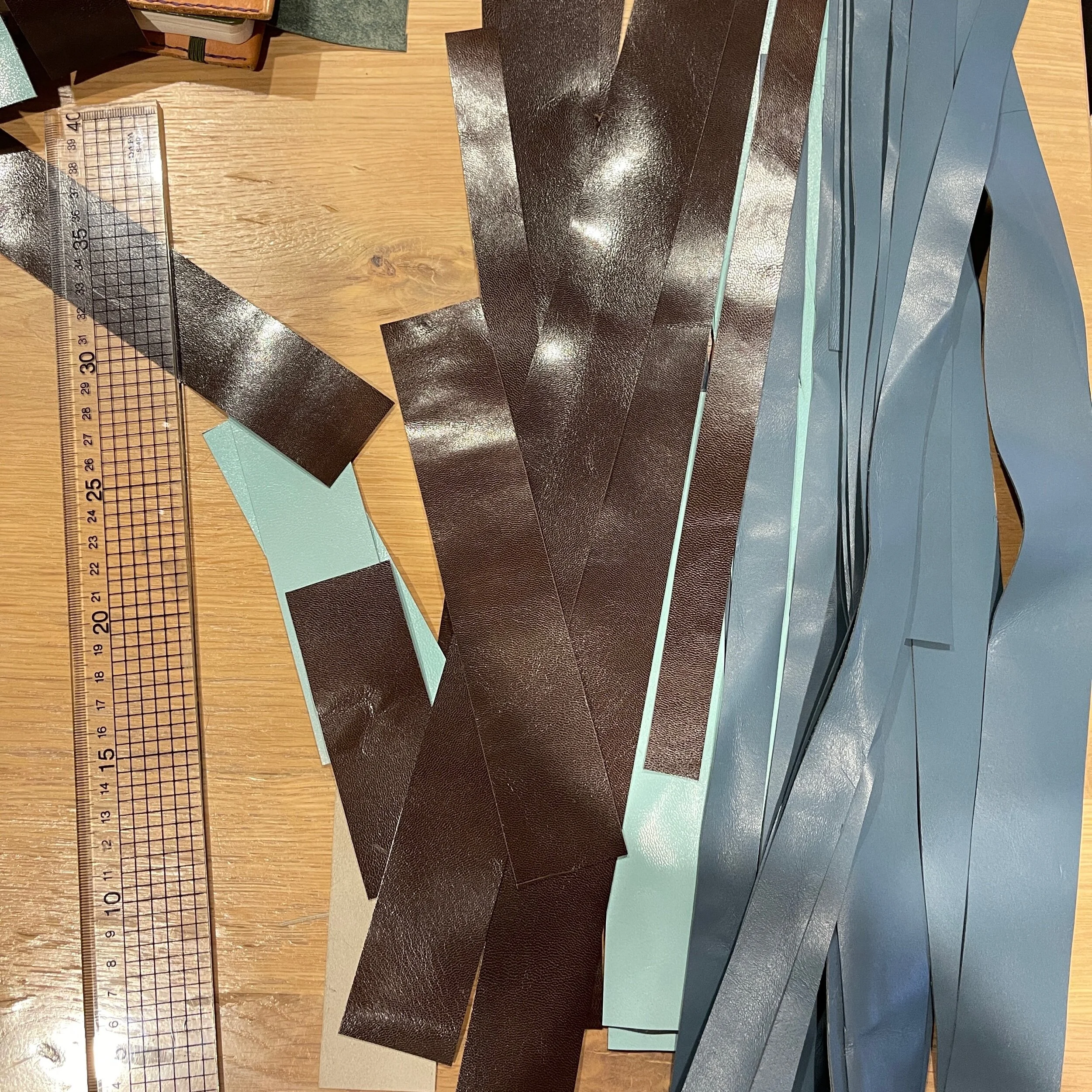 所以这几张nappa一直屯着没机会用,而且不知为何会挑这样的tiffany蓝和有点荧光的西瓜红,很怪的颜色。原本打算在淘宝买带条做编织,后来考虑了一下就别浪费之前买的皮料,正好做个实验。