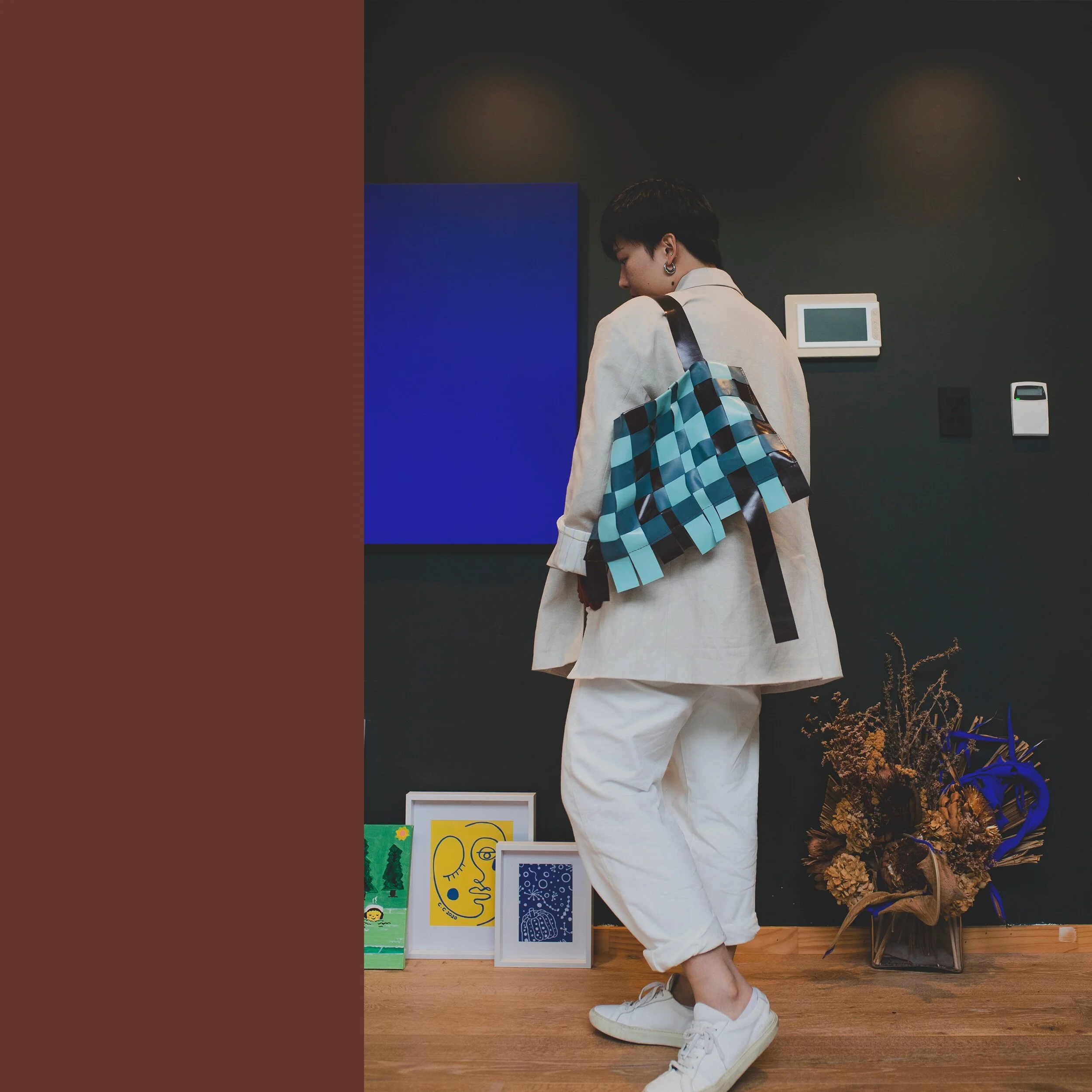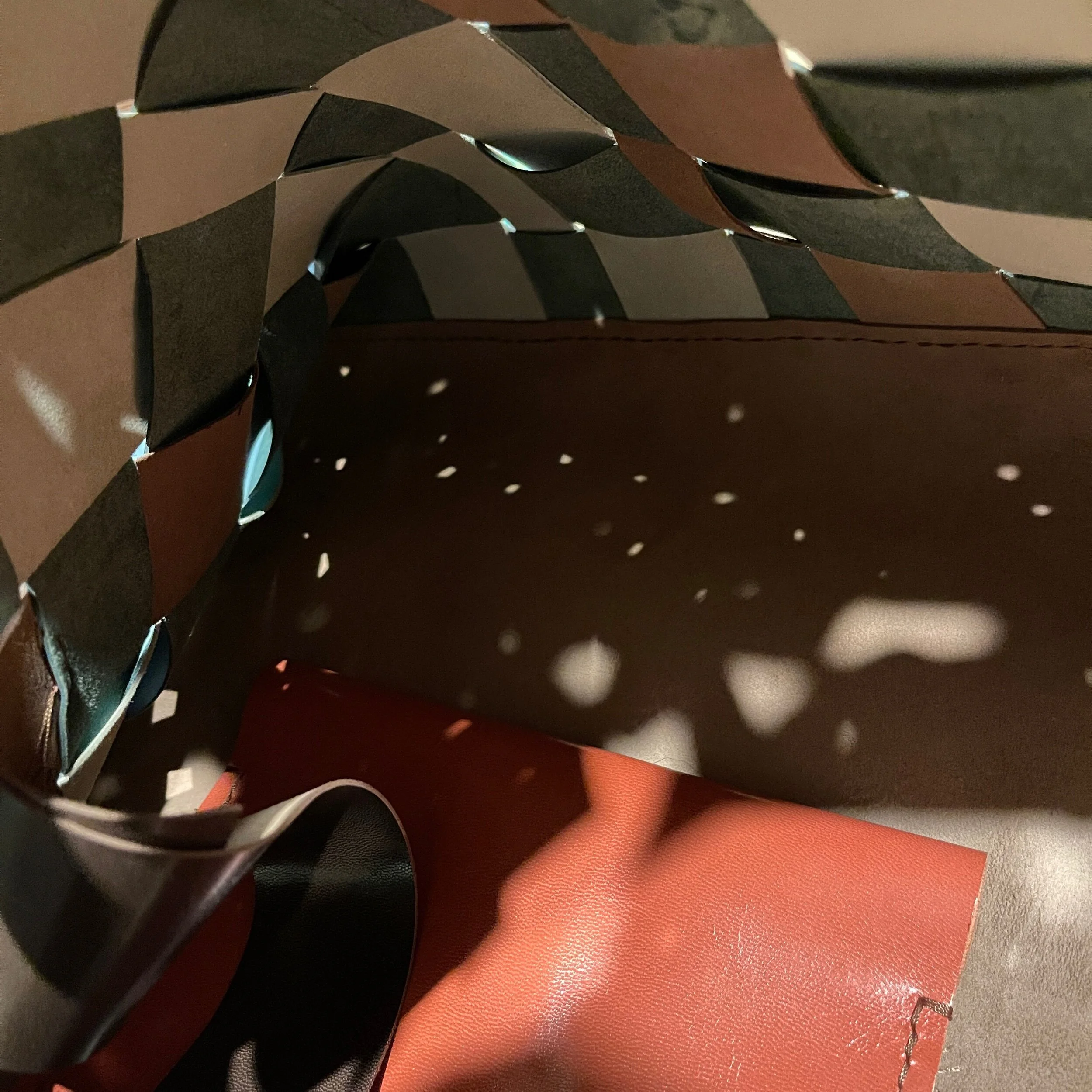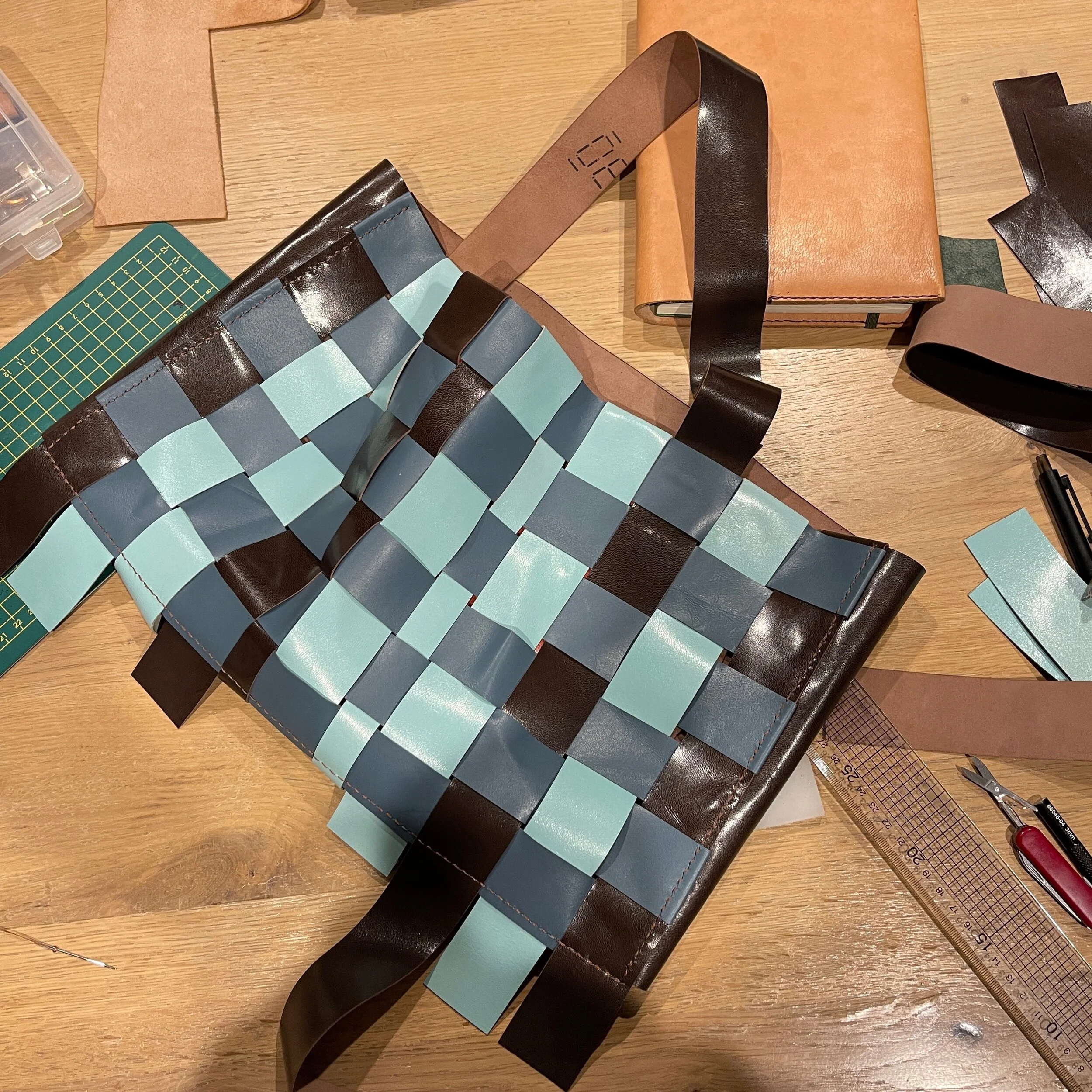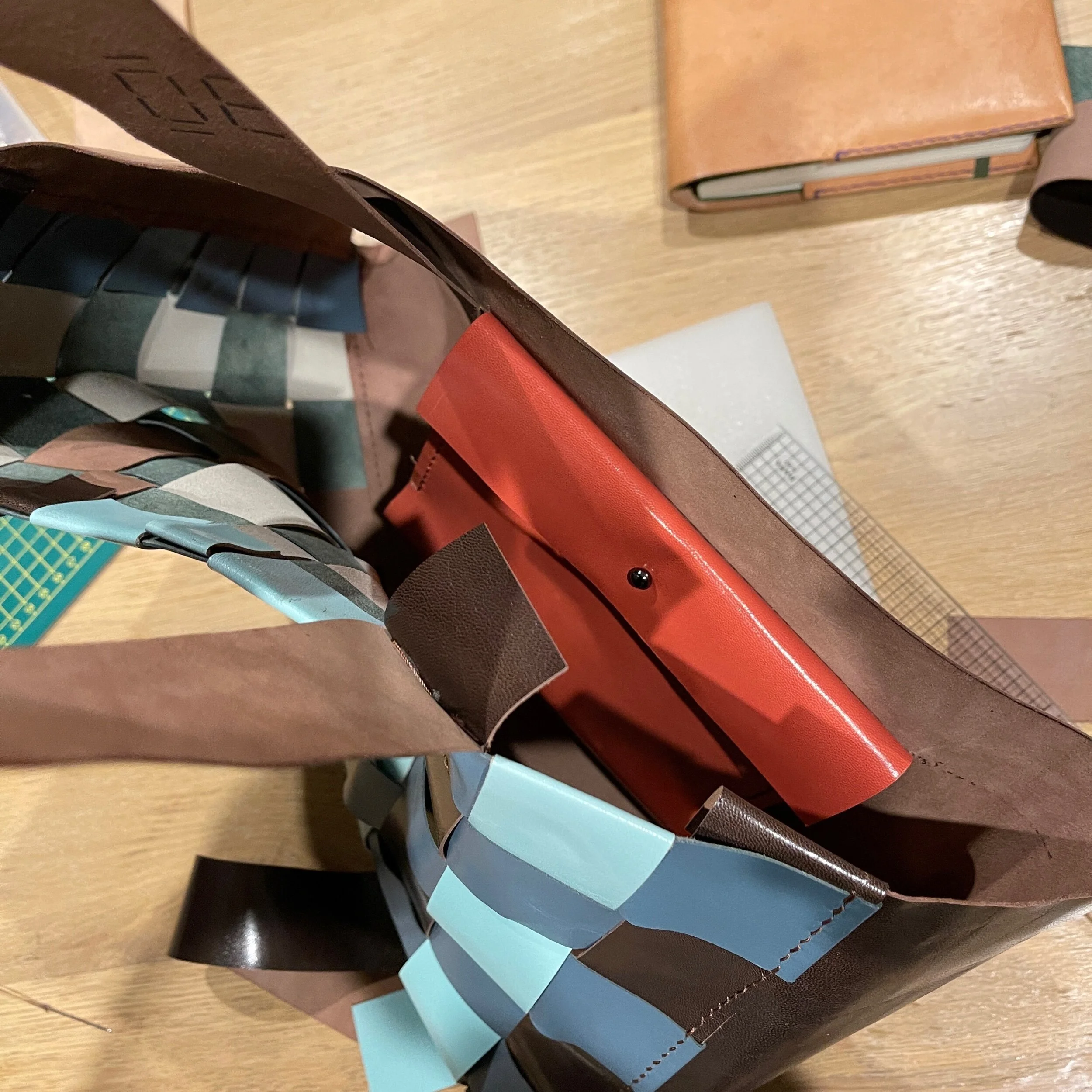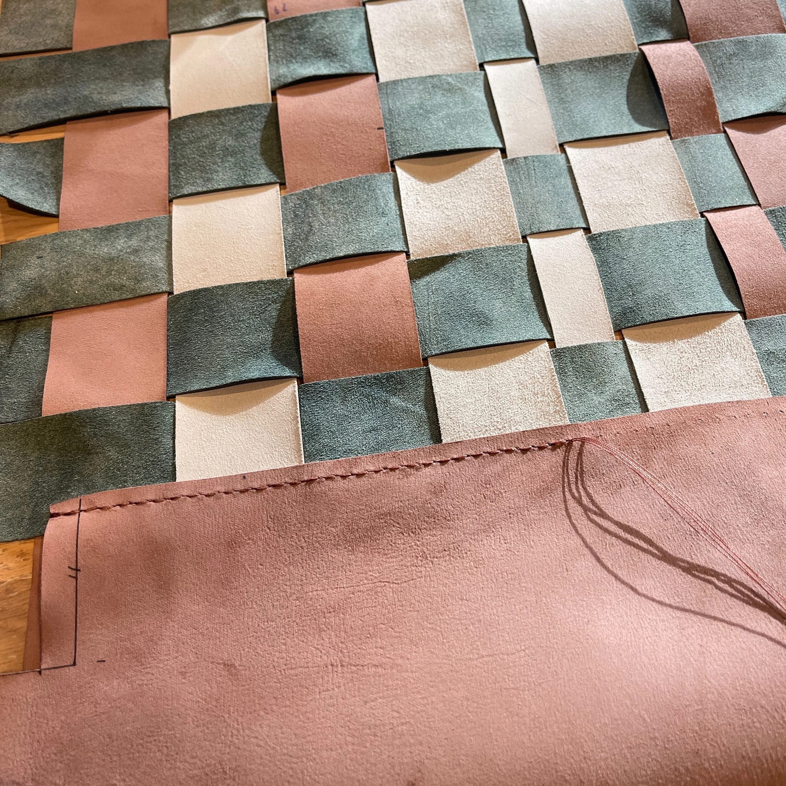 尽可能裁剪40mm宽的带条做了一面400×250mm的编织,作为包的正面,肩带用了同颜色的带条做延伸,从前方绕到斜后方固定。