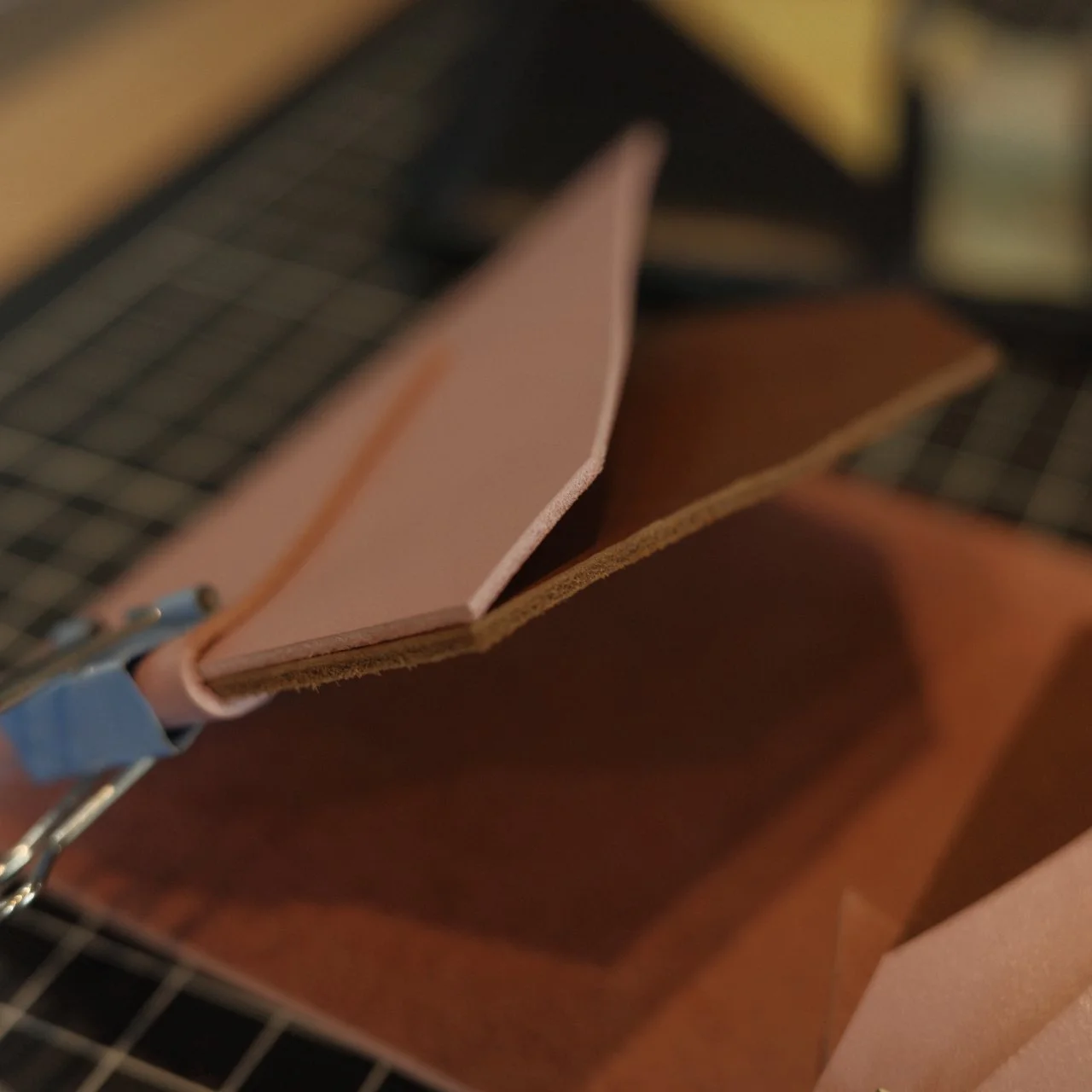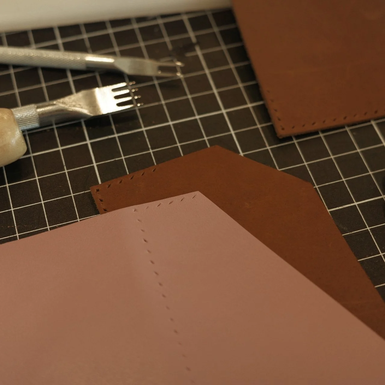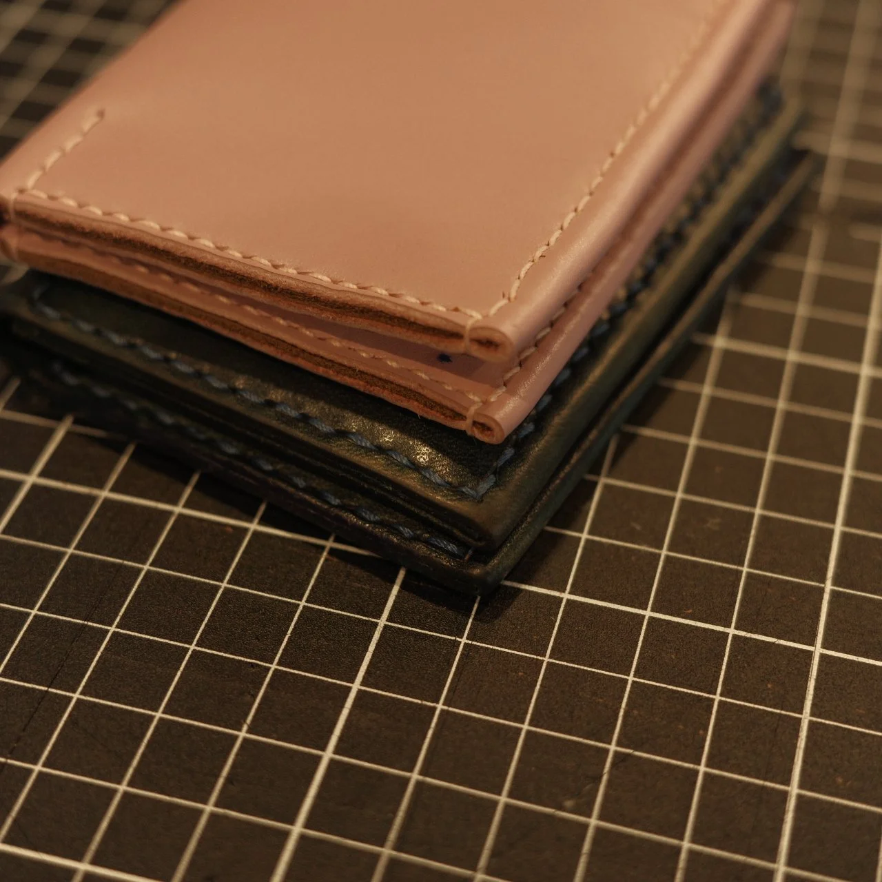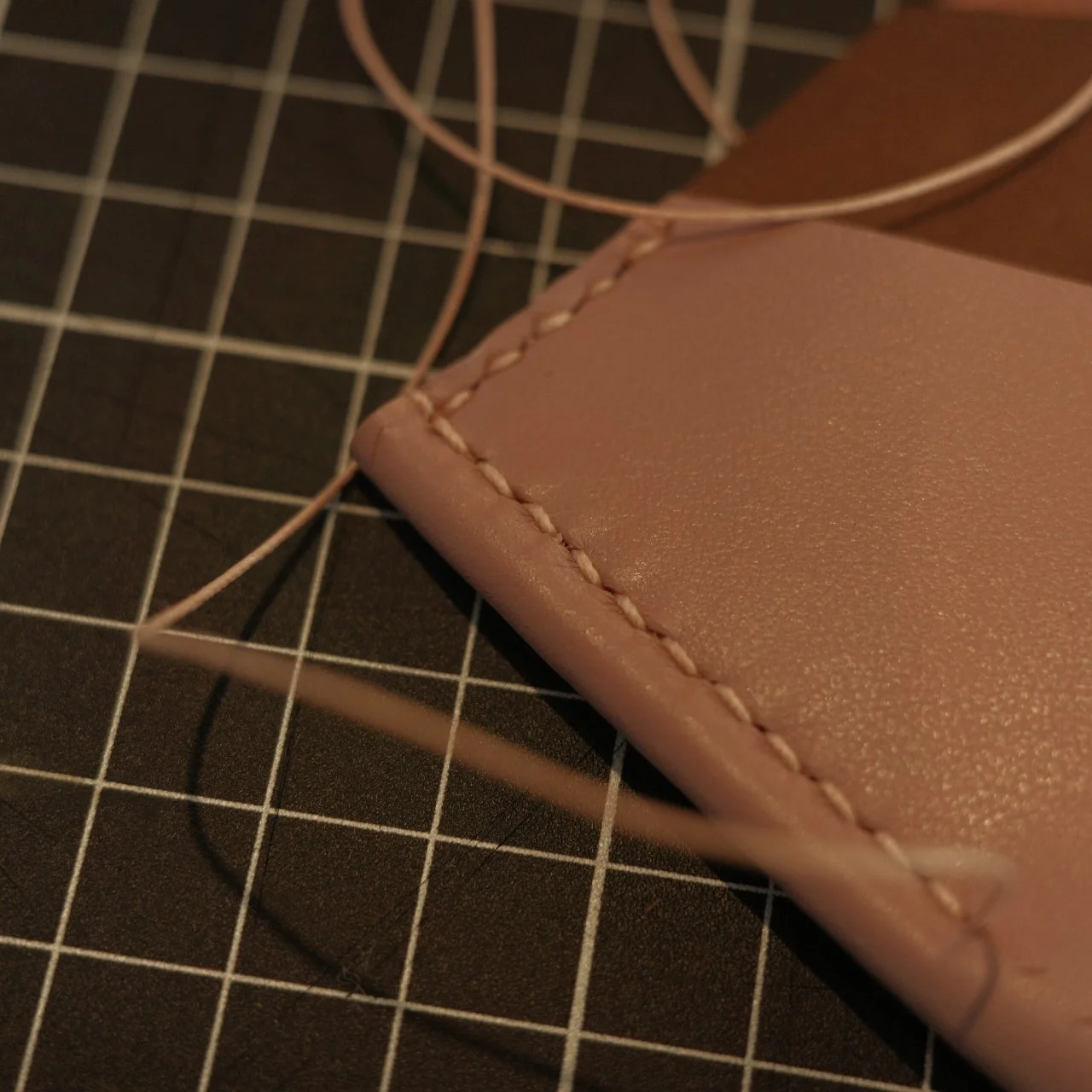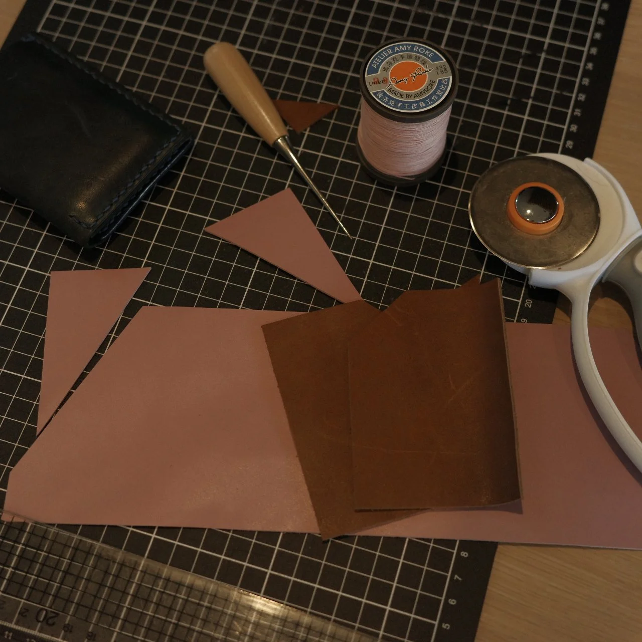 这次的皮料是没有翻车的粉色,缝线也是尽可能同色系,挑了棕色的皮作为夹层,光泽和厚度都合适。测量了原来的卡包尺寸以后就开始切皮料,打孔,缝线。制作总用时大约3小时。与其同时,我的专注力可以达到百分之百不间断的制作以确保记住每一个打孔的顺序和即将缝制的顺序不出现错误。