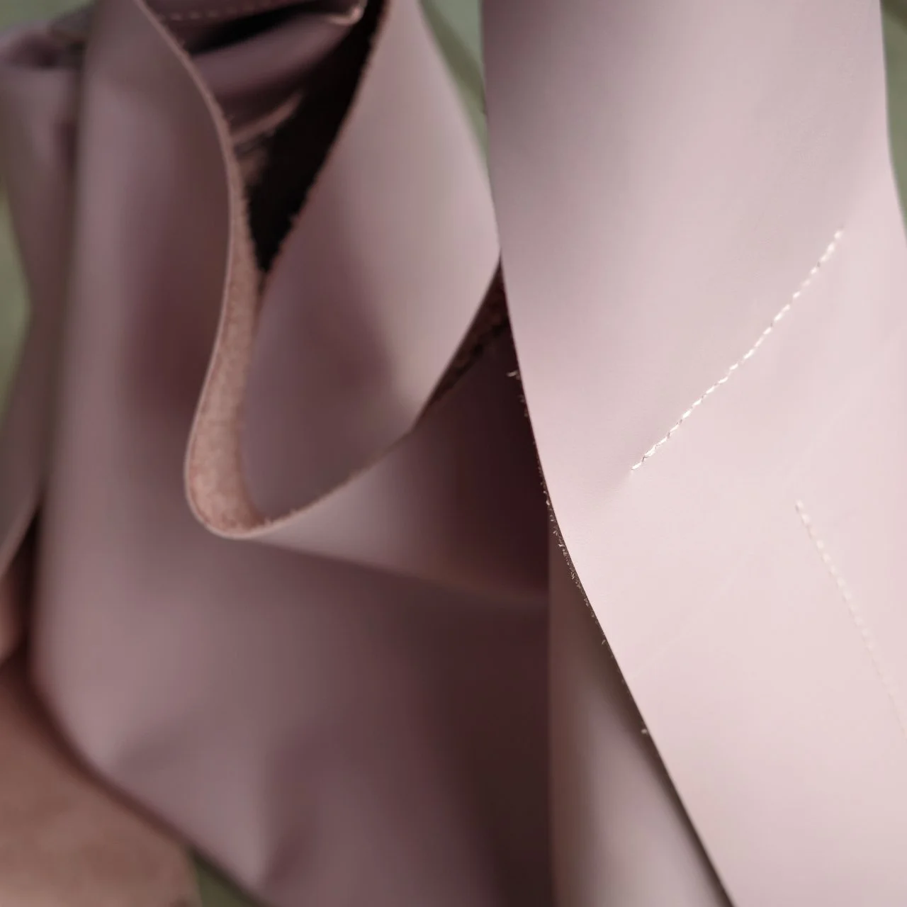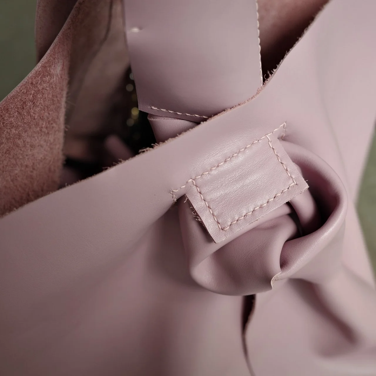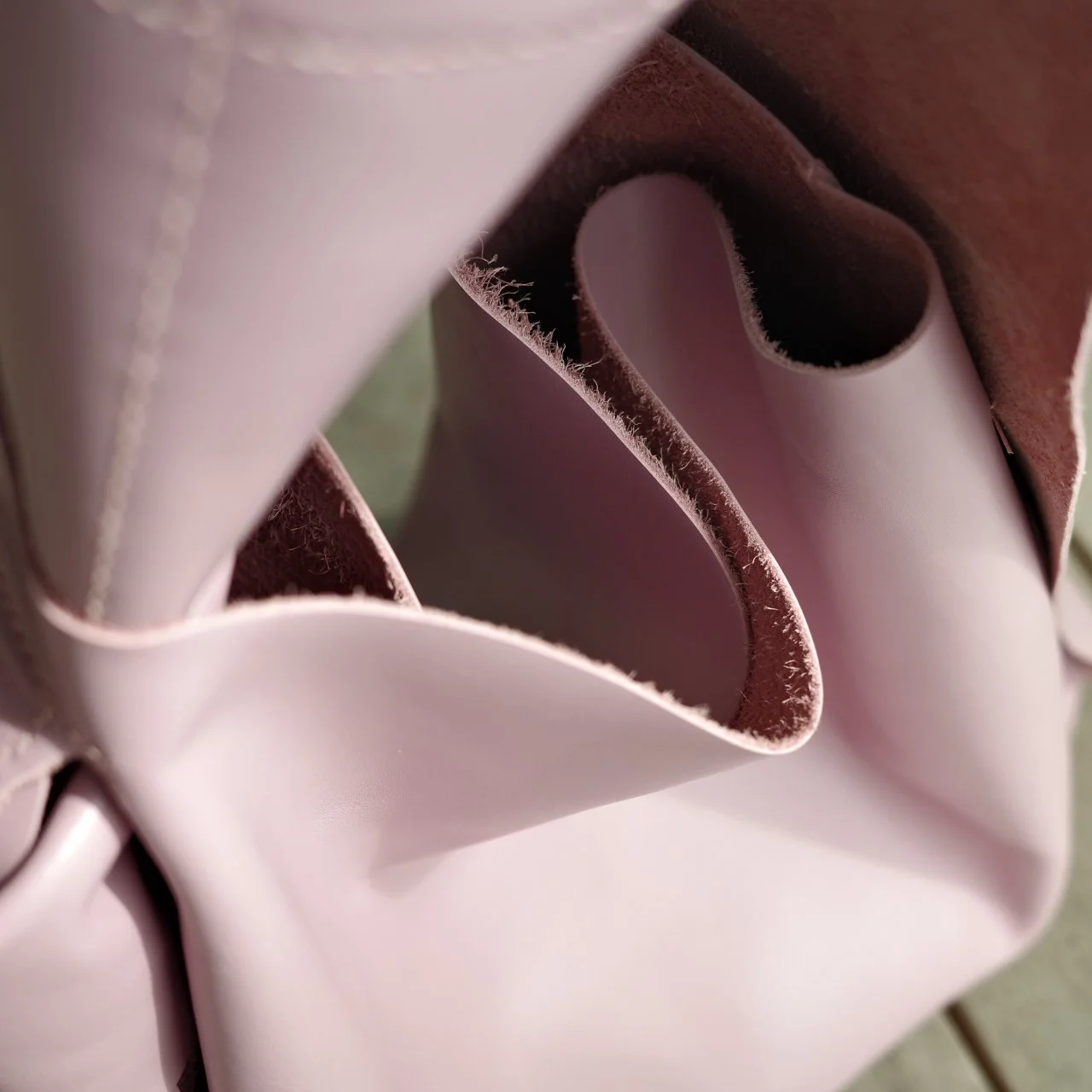 包的底部尺寸很大,为了可以放重物却不会导致过分的凸出,多缝合了一块皮料用作底部支撑,内部看也会精致一些。整个包身我保留了背面的绒面,缺点是皮边缘有毛絮,而且容易掉渣,但是我依旧爱这种随意,粗野的细节。