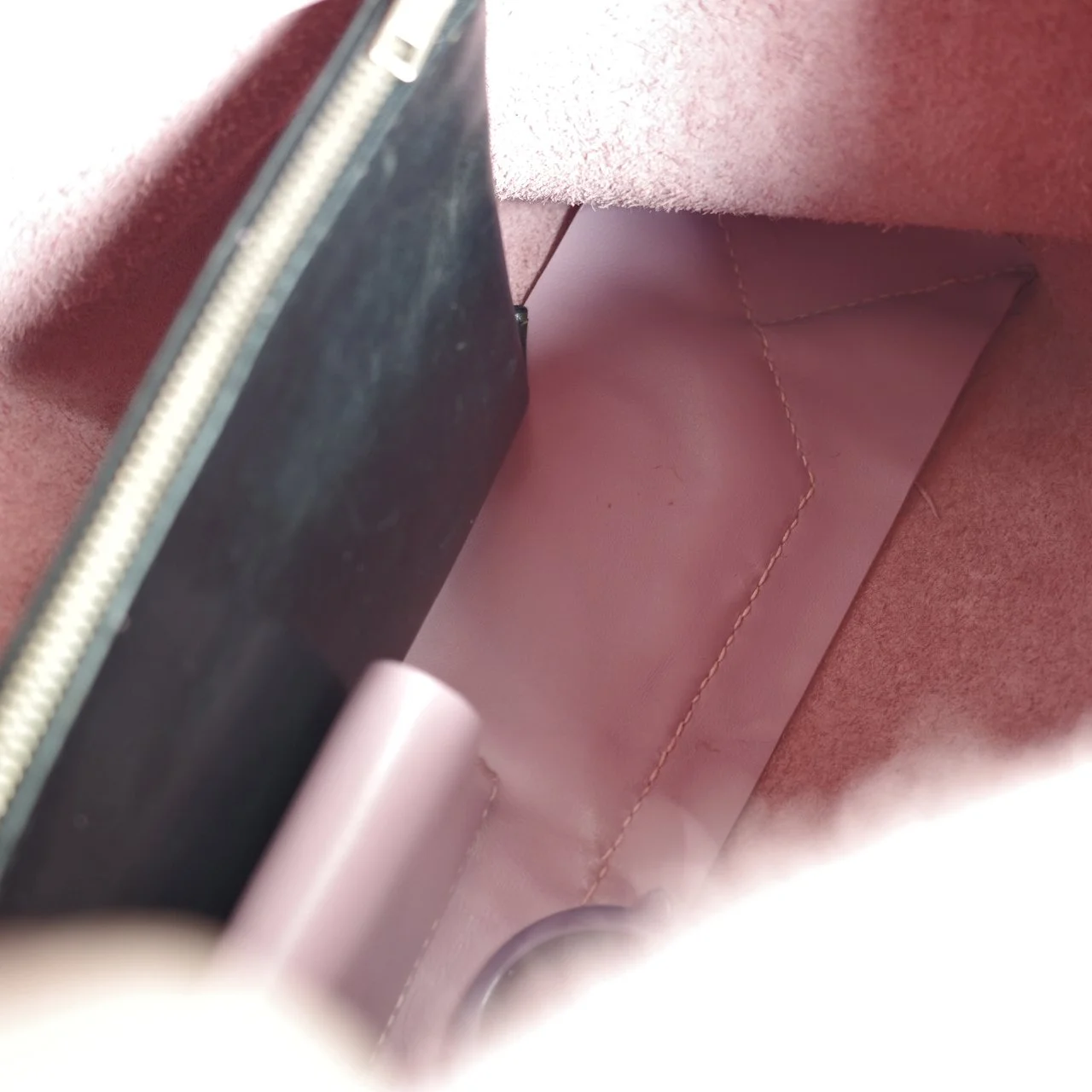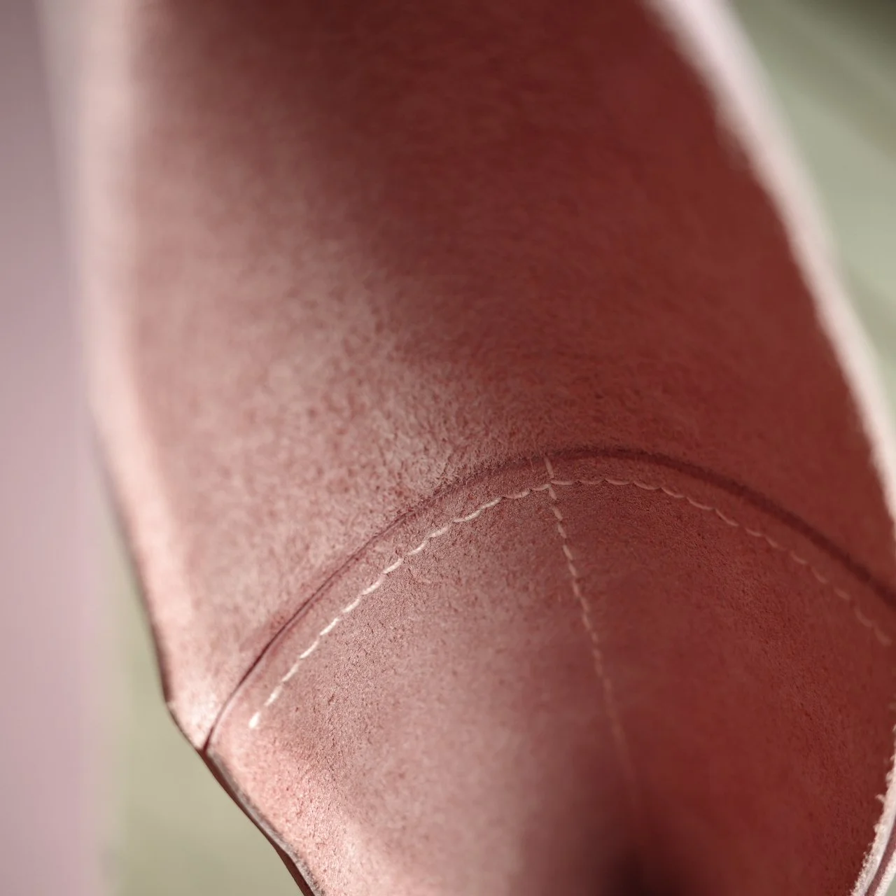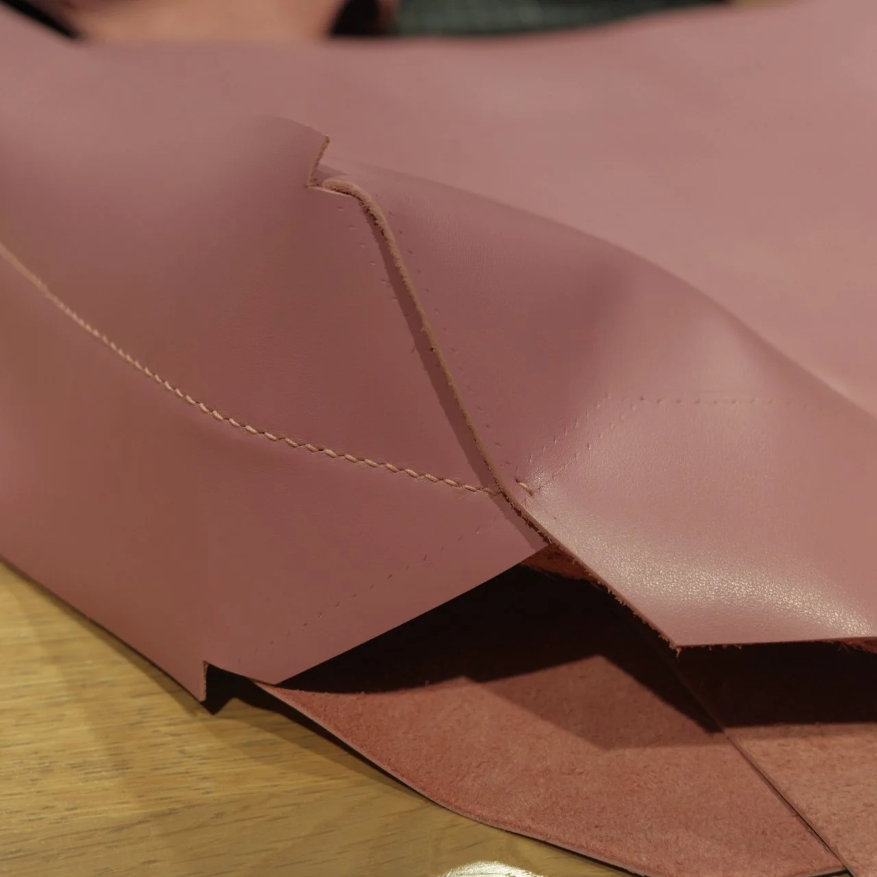 包的底部尺寸很大,为了可以放重物却不会导致过分的凸出,多缝合了一块皮料用作底部支撑,内部看也会精致一些。整个包身我保留了背面的绒面,缺点是皮边缘有毛絮,而且容易掉渣,但是我依旧爱这种随意,粗野的细节。