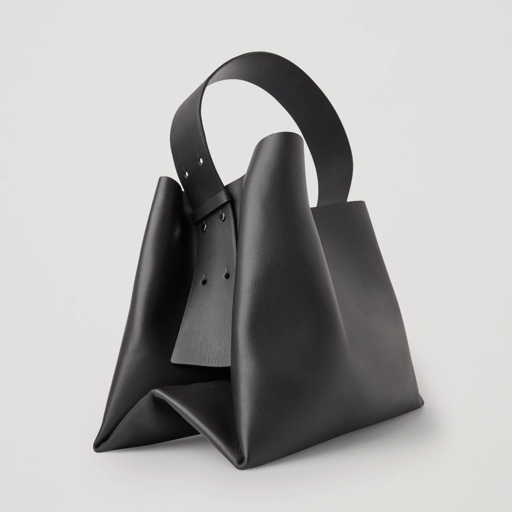 第二款是COS的单肩包,底部折叠像折纸是立挺的构造,侧面看不见任何缝线,用五金件固定和调节肩带。