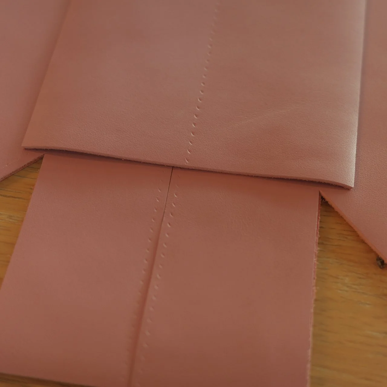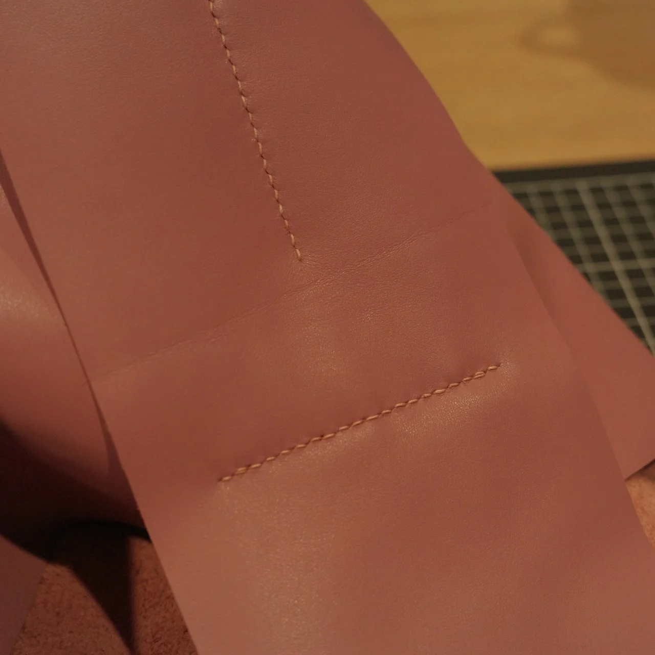 因为复杂程度,这次无法徒手在皮上画图纸,用了REVIT把整体图纸画出来,然后把部分尺寸按照1:1画在纸上,没想到在短边侧面缝合线的位置,还是出现了严重误差将近10mm,误差来自少算了重叠的3mm缝隙叠合处,导致包身厚度不够达到100mm,缝线也不居中的问题。