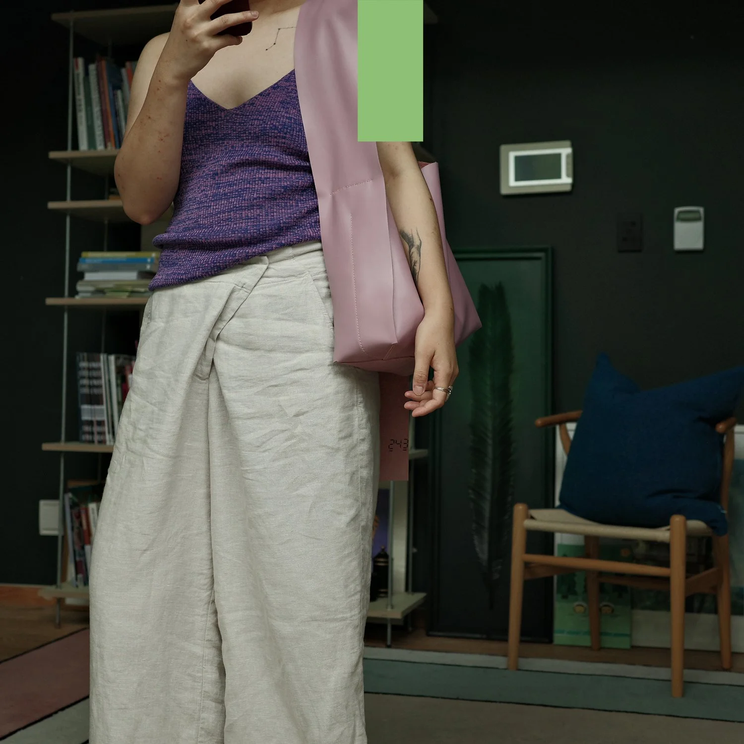 整体看这个包和CELINE的托特更相似,只是细节的比例大小改变了。单肩背的方式着重凸出了宽肩带,单层皮柔软但是缺点是不够硬挺。很满意粉色肩带以几何图形的方式,占据很大一部分身体的比例。而侧身的和身后的打结依旧体现了皮料的柔软和光泽。