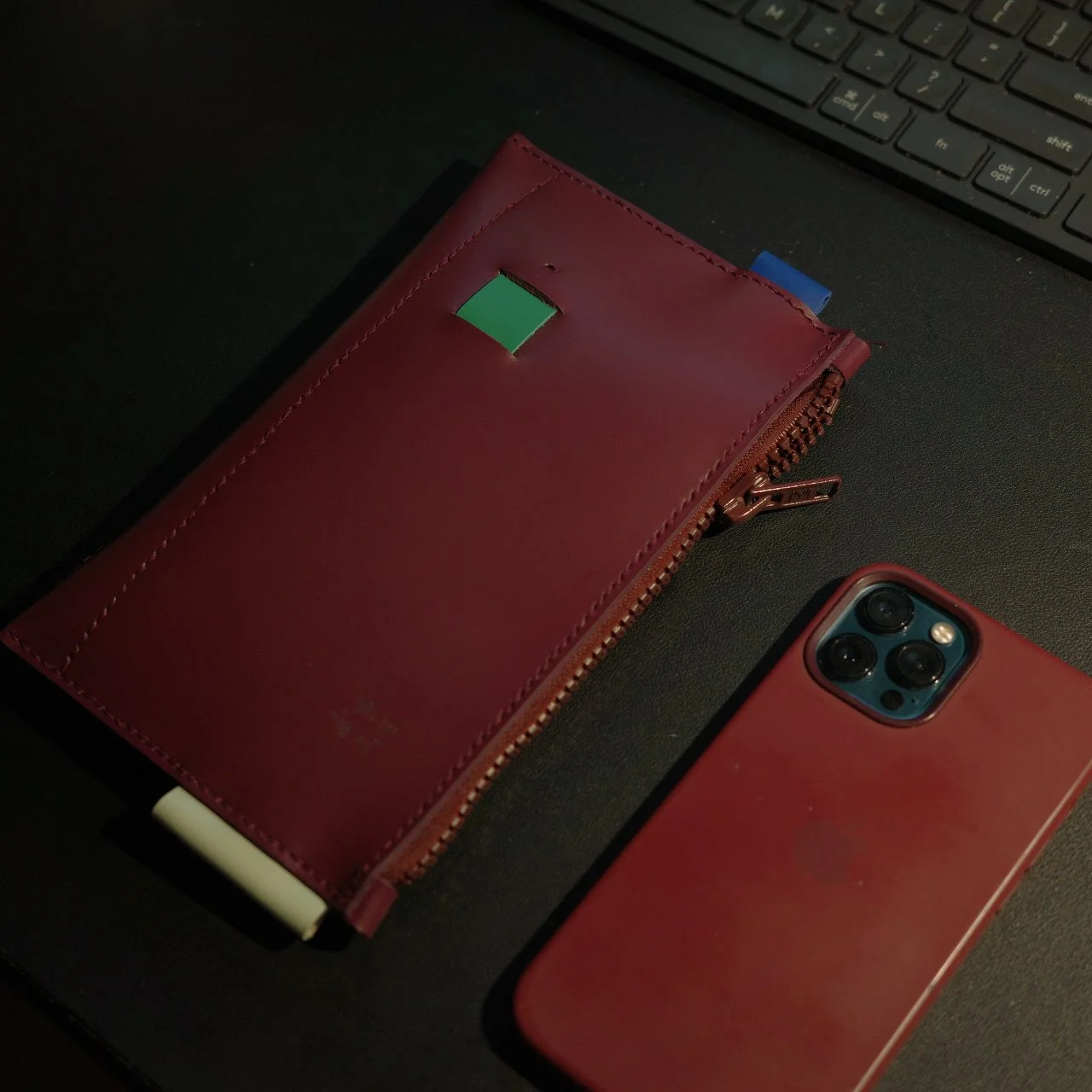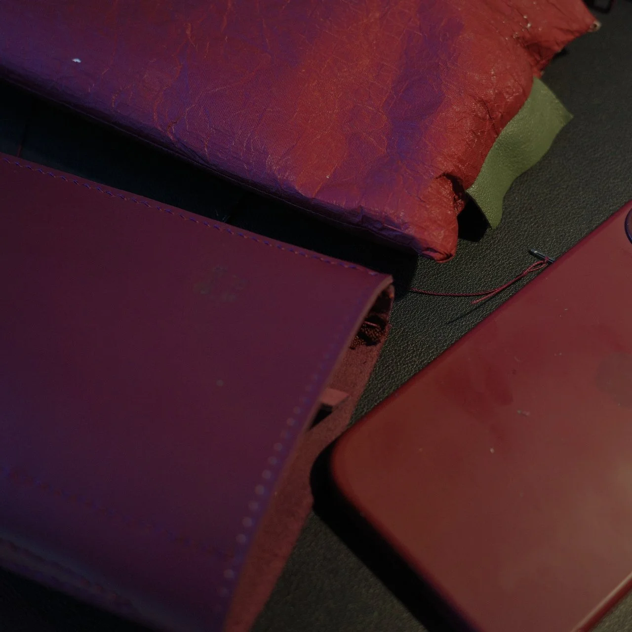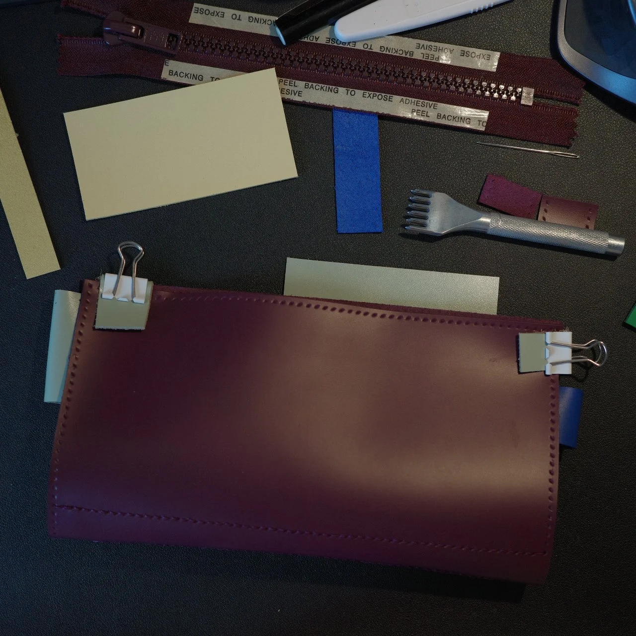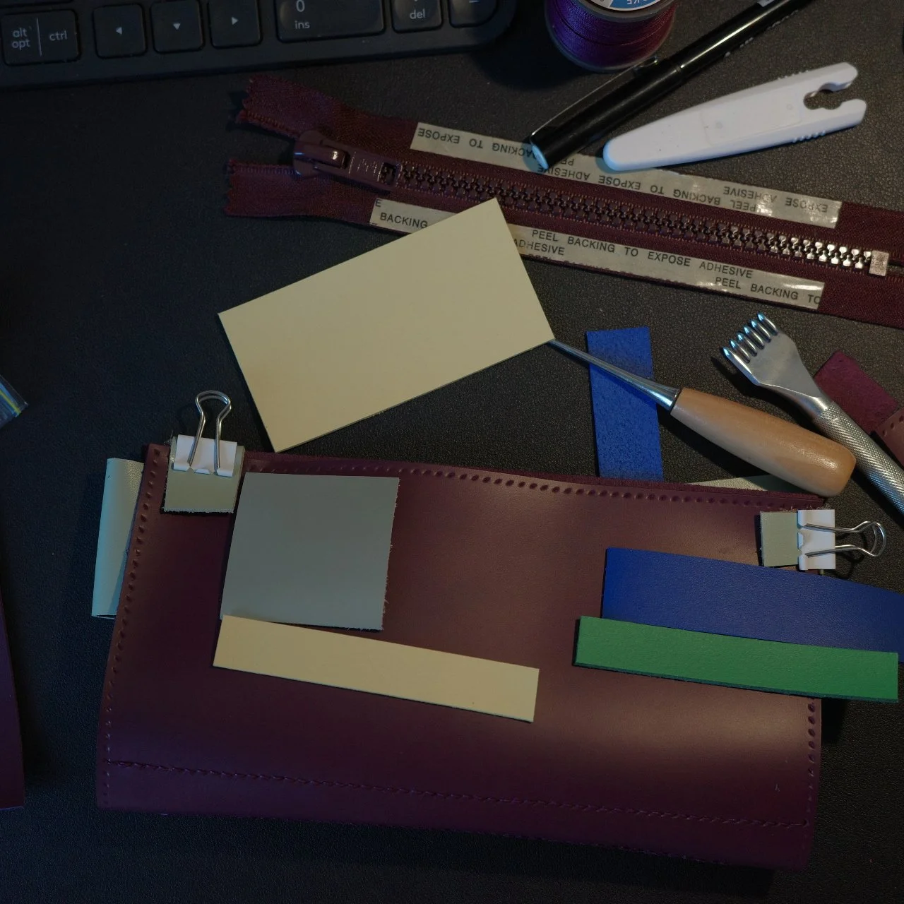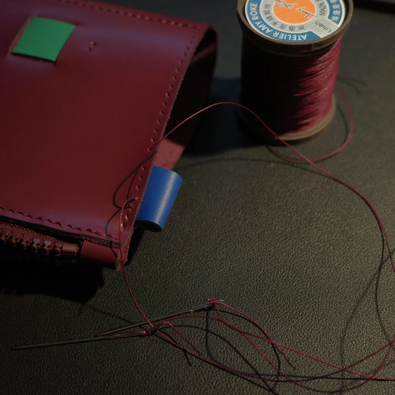 2023 色块收纳包 手工皮具 Jul 30 Written By geri wang 在淘宝买了一个收纳包的纸质图版,因为看中有弧形凹陷底部,就想买了学习一下,后我并没有跟着图纸的洞口走,弧线也很难切得很好,所以定位就有位移,缝得底部非常混乱。图纸的内部有三层叠在一起的卡包位,我也没有跟着缝,只留了一层,担心皮料太厚了,侧面会不好看。但是还是有一层,还是能看到多一层皮料在侧面,多加了“耳朵”在侧面也是为了遮住。正面能看到蓝色和薄荷绿色块,反面烫印在右侧,20x20mm的绿色点缀在左侧。 geri wang