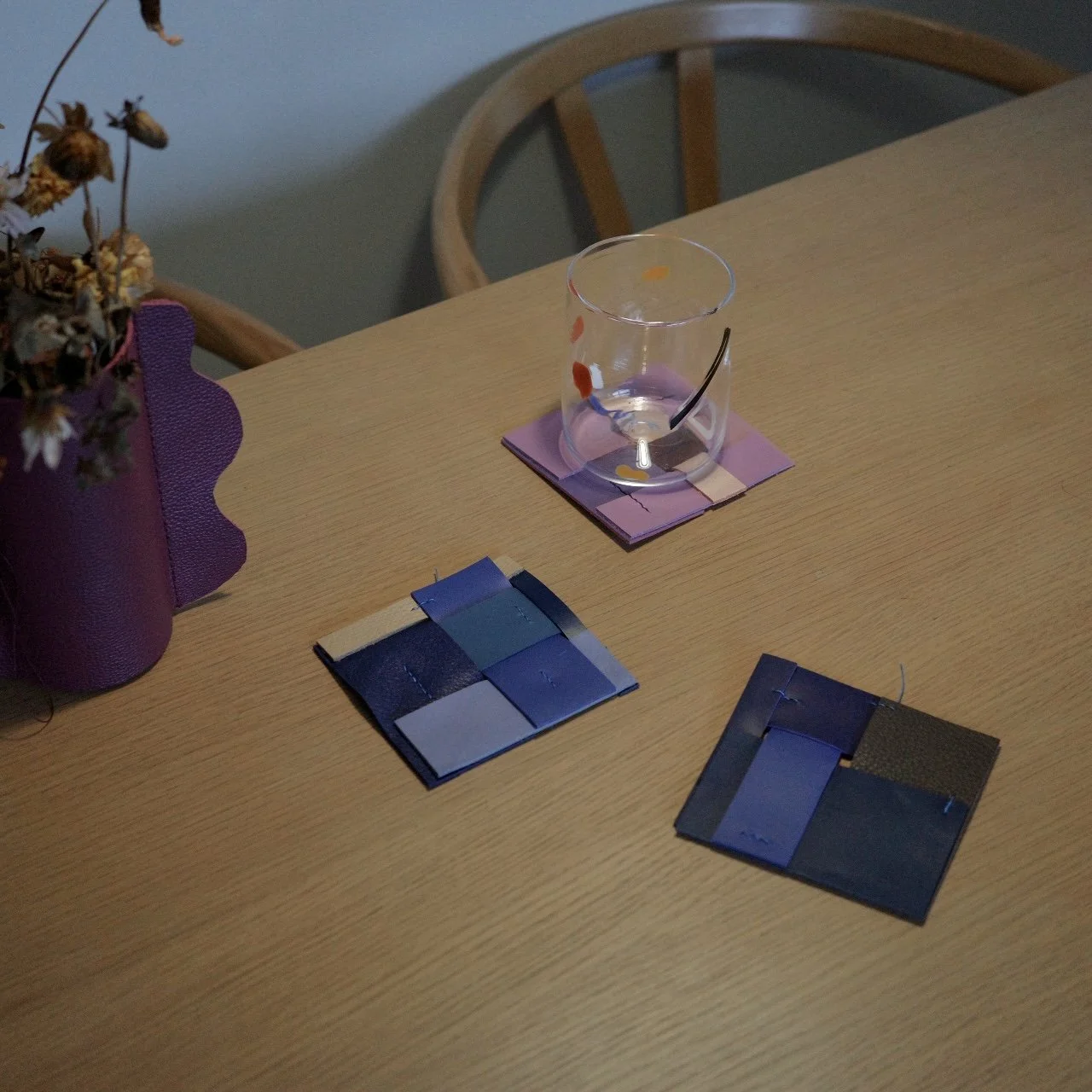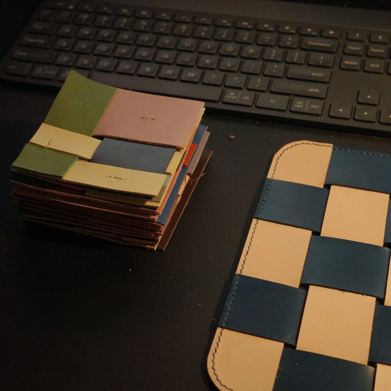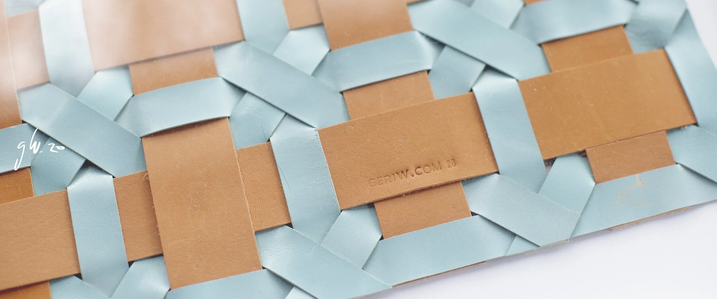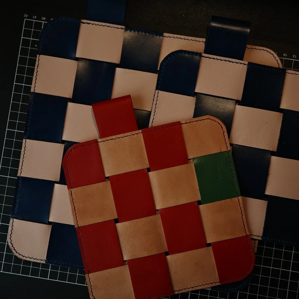 在2022年年底,我做了第一个版本的编织皮垫,其功能为锅垫,用了最基本的平纹编织技法,皮带宽度40mm,精确到每条皮带间隔5mm。手缝线非常整齐,包括圆弧边的拐角,我自认为这是一个保守设计,完美犹如工厂流水线出产,在我这里这并不是一个褒义词。而不管是杯垫还是锅垫,如何玩编织成为了一个新的挑战。