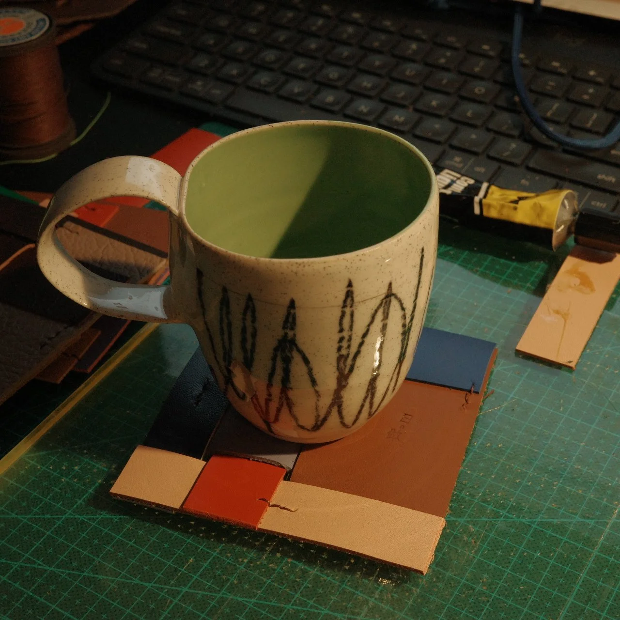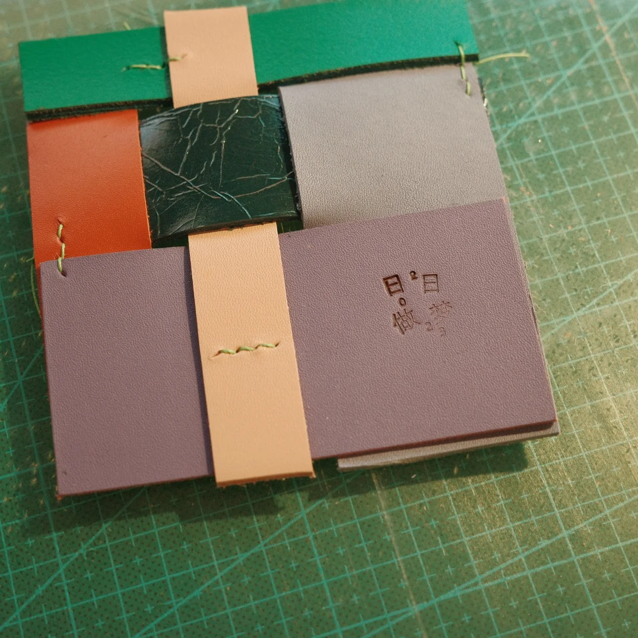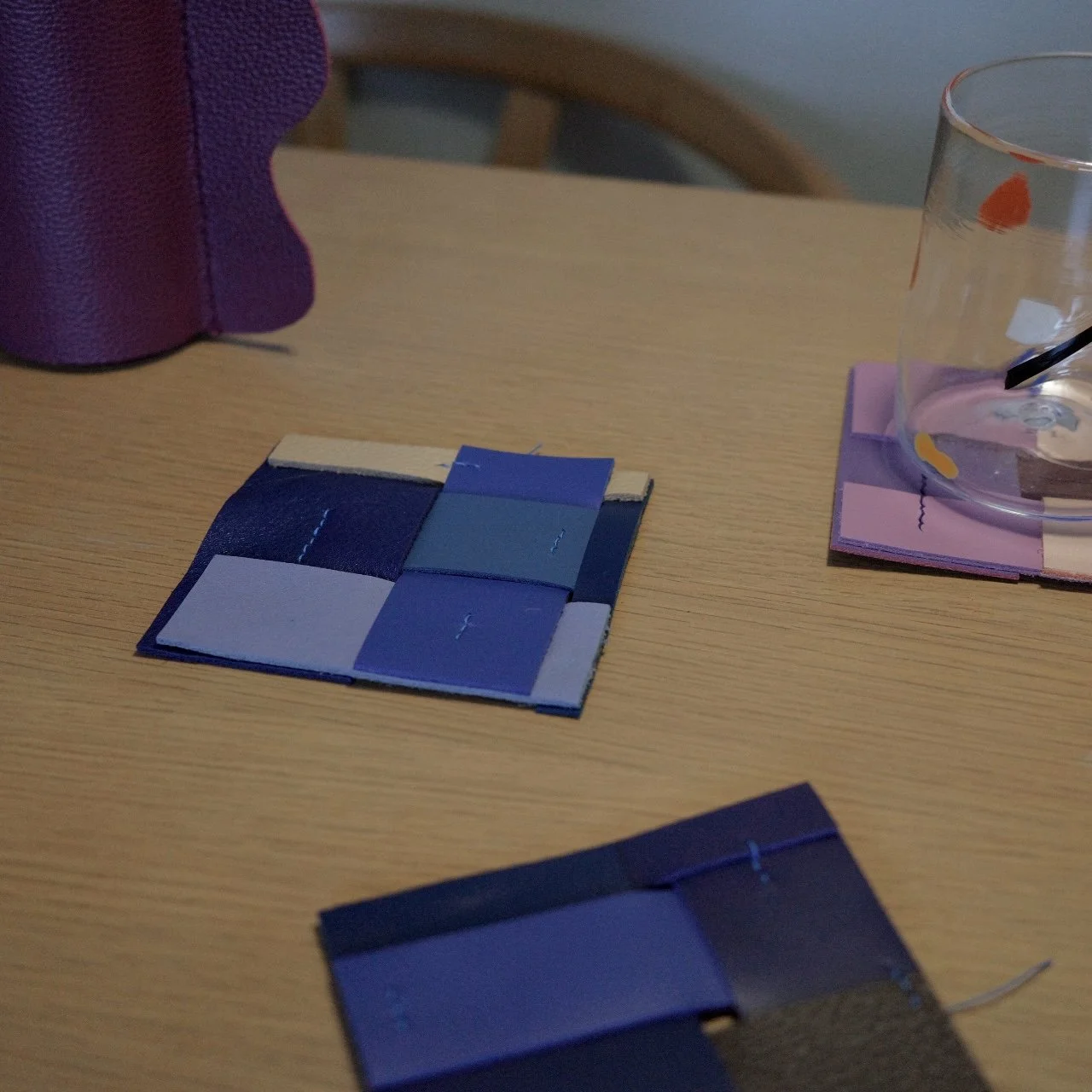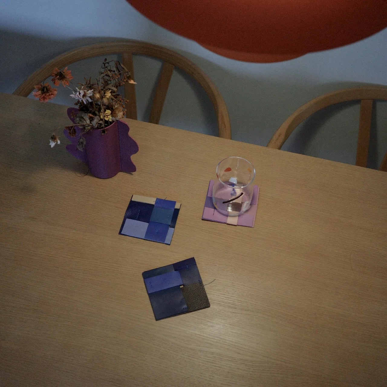 在2022年年底,我做了第一个版本的编织皮垫,其功能为锅垫,用了最基本的平纹编织技法,皮带宽度40mm,精确到每条皮带间隔5mm。手缝线非常整齐,包括圆弧边的拐角,我自认为这是一个保守设计,完美犹如工厂流水线出产,在我这里这并不是一个褒义词。而不管是杯垫还是锅垫,如何玩编织成为了一个新的挑战。