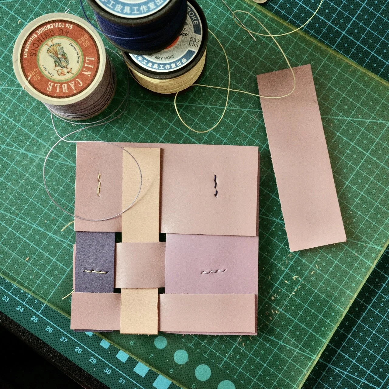 第二个版本的编织是用六片皮条,宽度10mm-50mm不等随机搭配,也是用了最基本的平纹编织技法,使用uhu粘合固定后,缝线可以选择在任何一个位置用加固。我没办法说编织是原创,但是缝线的方式的确是原创。