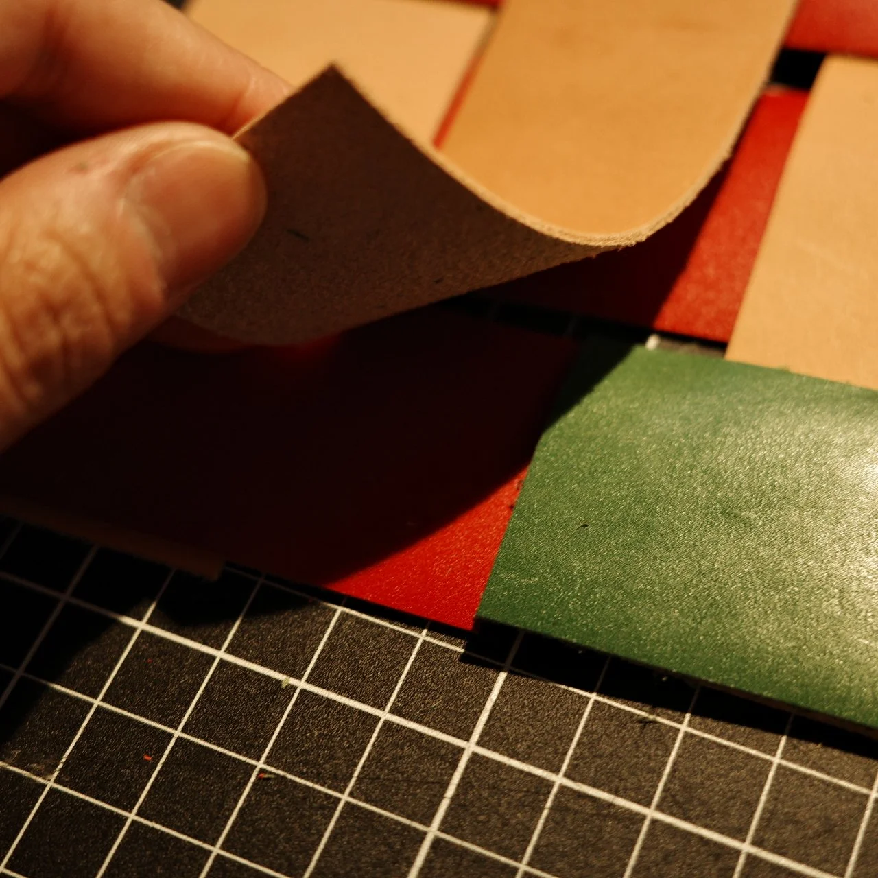 皮带尺寸是40mm宽x175mm长,一共裁剪8条,每条皮带间隔5mm。在编排好配色以后用夹子固定,使用UHU粘合。