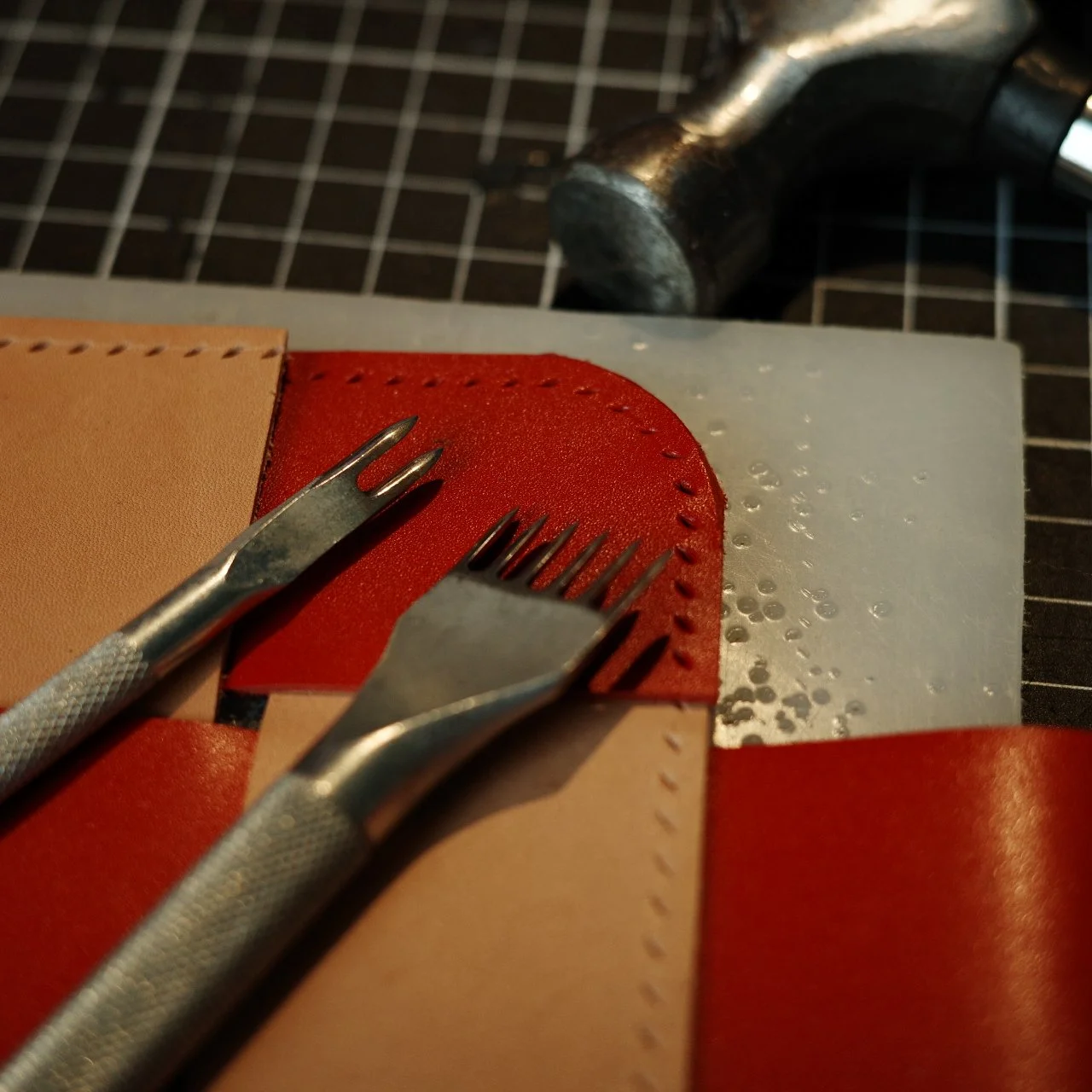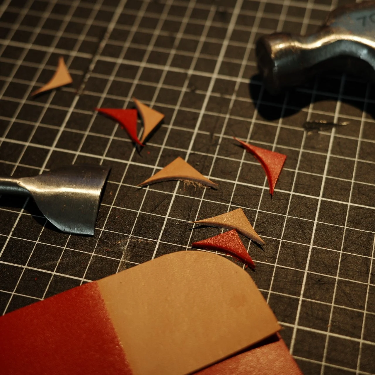 用工具划出即将打洞的辅助线,先用菱斩在辅助线压出印子,这是为了确保洞口的准确性,尤其在圆弧边。